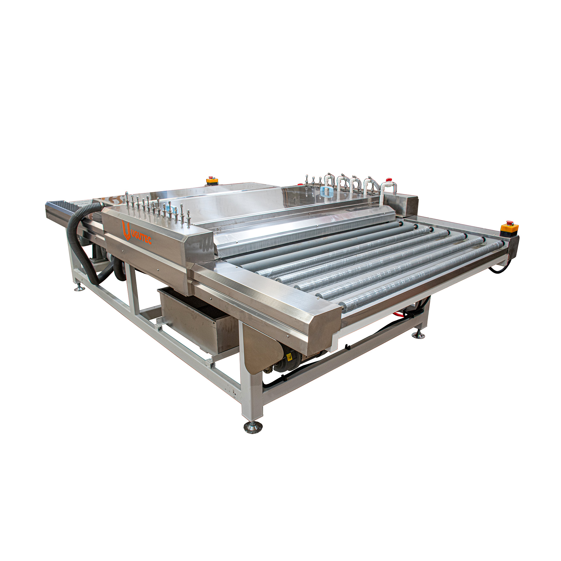 La lavadora horizontal de vidrio UguTec está diseñada para lograr un lavado y secado eficiente de vidrio plano, garantizando un rendimiento confiable en procesos de alta exigencia. Es apta para vidrio templado y vidrio Low-E, brindando un acabado limpio y libre de impurezas.