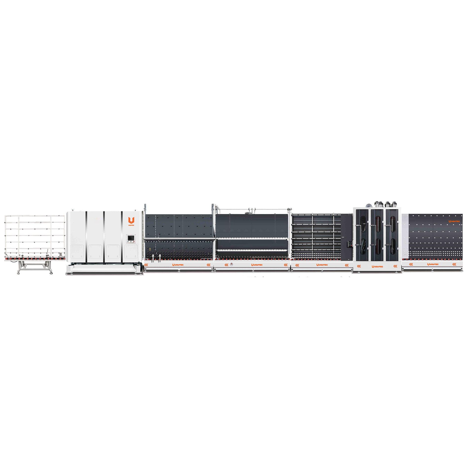 Esta línea puede realizar el ensamblado de DVH, tanto interior como exterior, llenar automáticamente con gas argón y fabricar vidrios escalonados mediante un sistema automático controlado por PLC a través de una pantalla táctil. Posee detección automática de vidrio con recubrimiento y de vidrio Low-E que permite identificar el correcto posicionamiento del vidrio. El sistema de tracción de la lavadora de vidrios se ajusta automáticamente según el espesor del vidrio. Para el lavado de vidrio con recubrimiento Low-E, la velocidad de rotación de los cepillos se puede controlar mediante un variador de frecuencia. Posee un sistema de posicionamiento automático para el espaciador de aluminio y el vidrio. Además cuenta con detección automática de la longitud y altura del vidrio, lo que permite un ajuste automático del tiempo óptimo de llenado de argón para ahorrar gas. El módulo de prensado y llenado de gas posee cuatro servomotores, con funciones de ensamblado, prensado y llenado automático de gas, asegurando que la concentración de argón en el vidrio aislante sea superior al 85%.