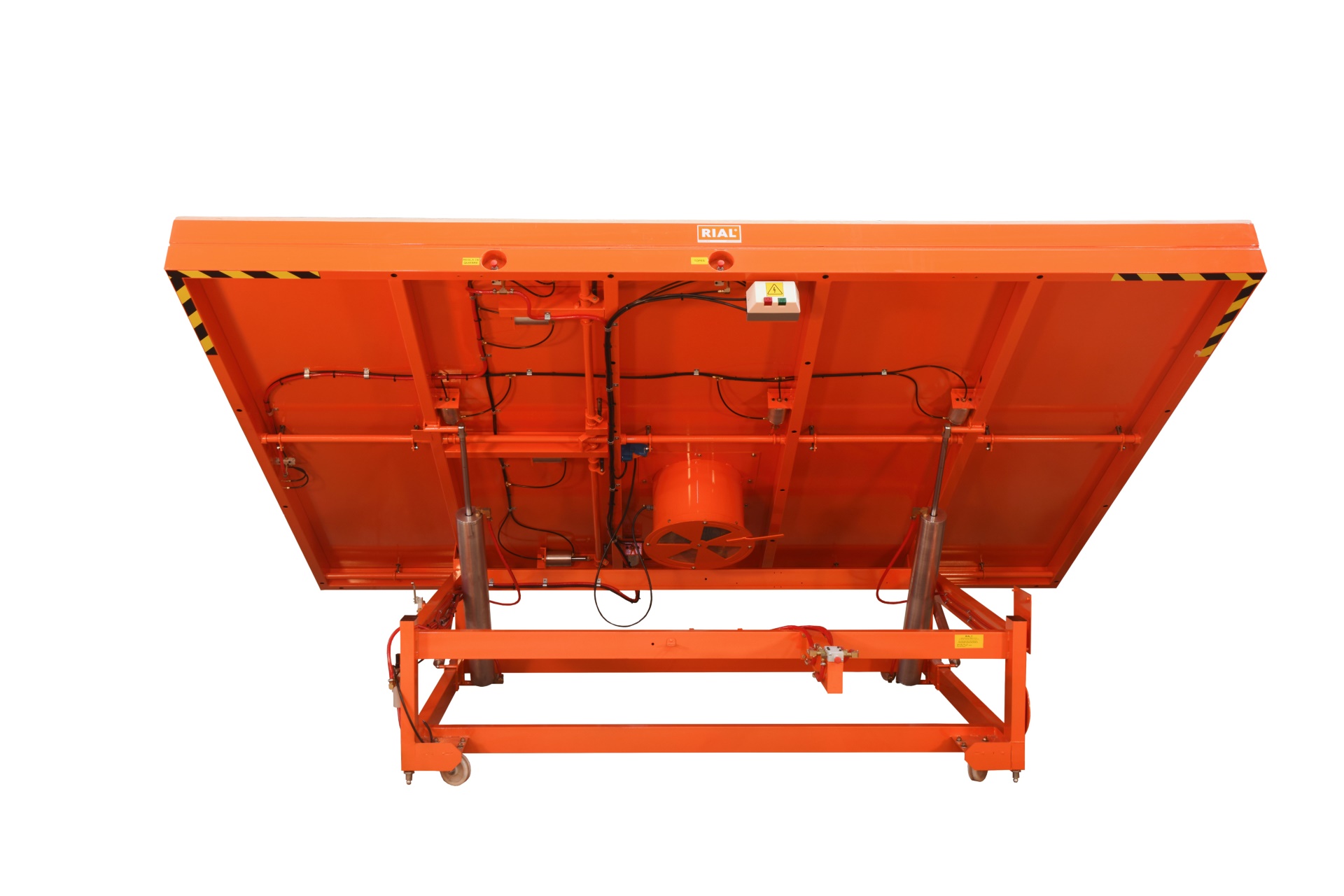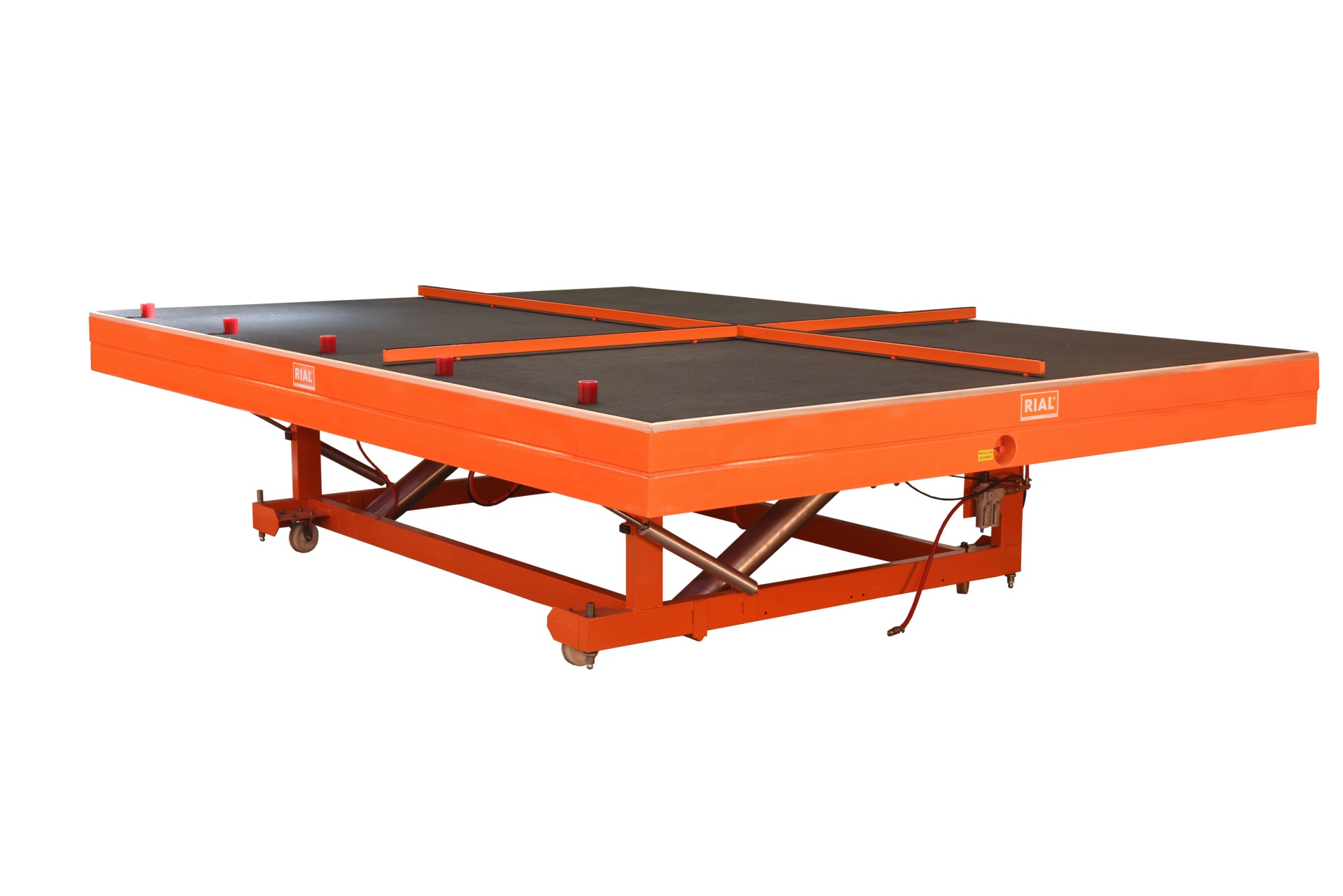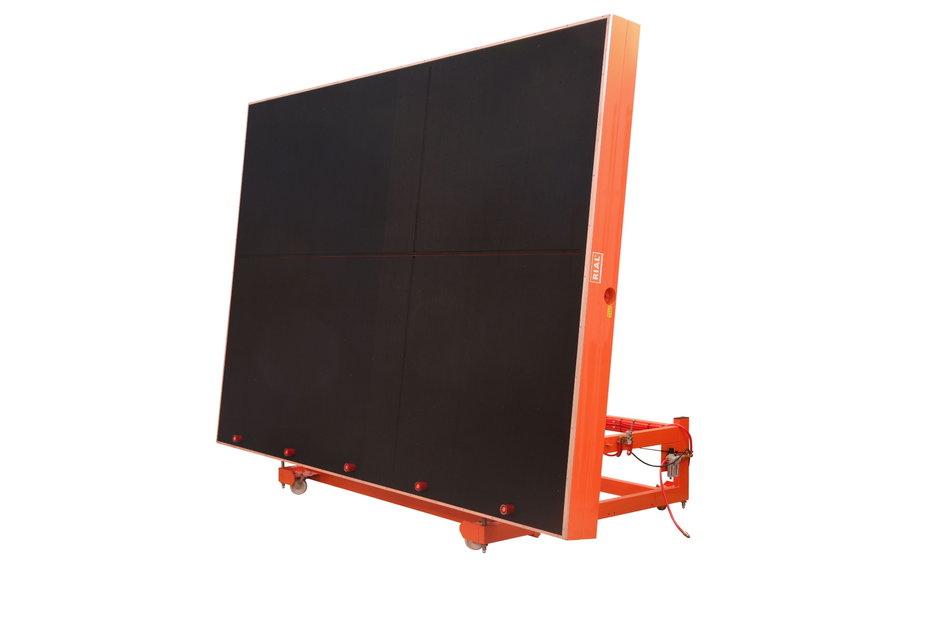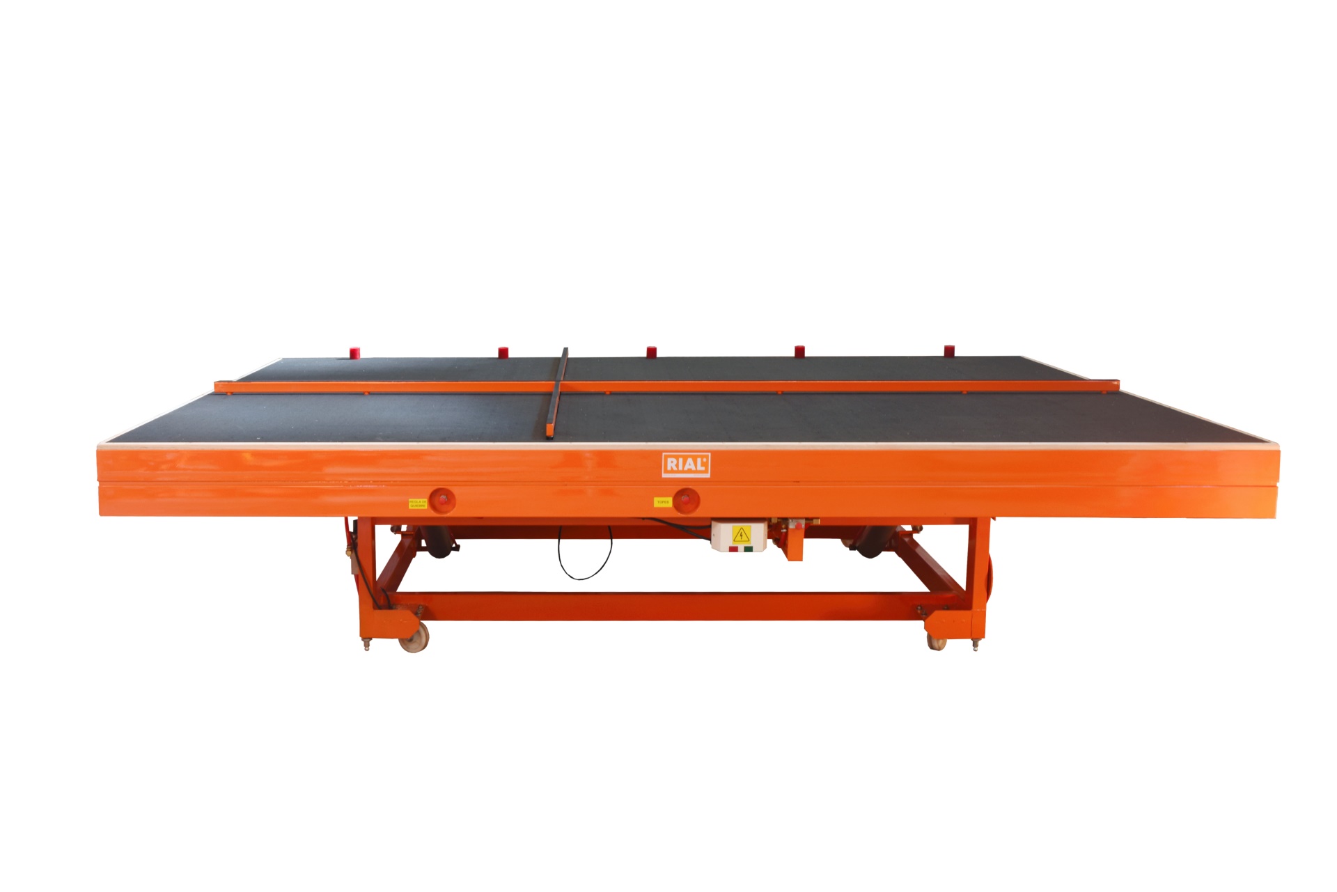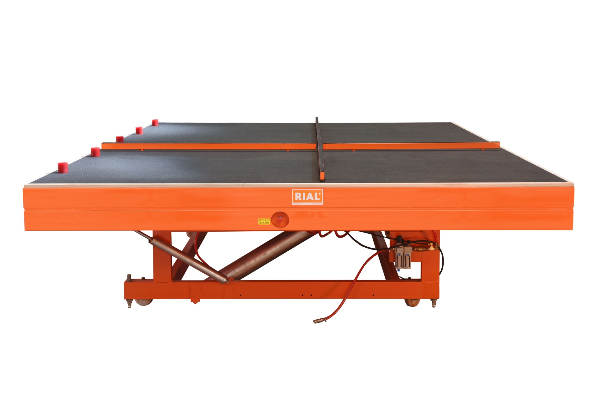 Las mesas de corte básicas RIAL para vidrio monolítico están diseñadas para espesores de hasta 19mm, e incluyen 2 reglas de quiebre de accionamiento por llave. Están montadas sobre ruedas para su fácil movimiento, son basculantes con accionamiento neumático, poseen colchón de aire y topes de apoyo giratorios y automáticos.