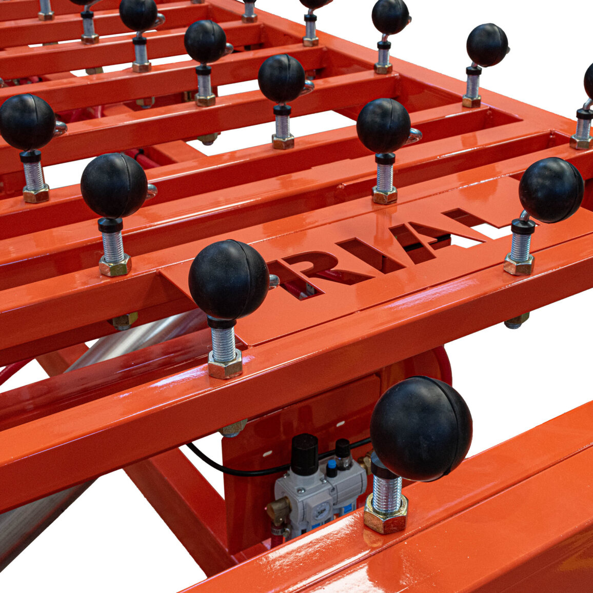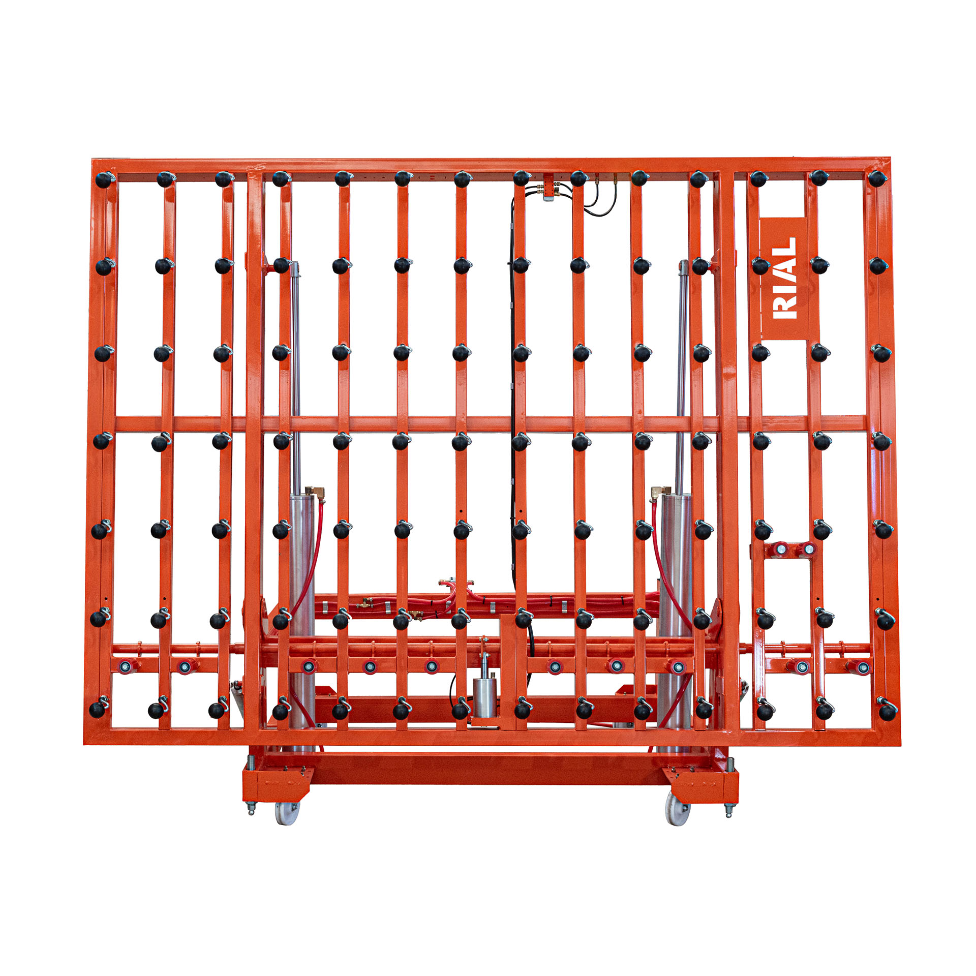 Estas mesas de esferas RIAL están especialmente diseñadas para complementar a las lavadoras en el traslado o movimiento de la placa de vidrio con total comodidad, trabajando sobre un plano de esferas que giran libremente permitiendo movimientos fáciles y sin esfuerzo. Están montadas sobre ruedas para su fácil movimiento, son basculantes con accionamiento neumático y poseen topes de carga para hacer segura la basculación. Su construcción con caño estructural de acero es de gran robustez y la terminación de alta calidad con pintura poliuretánica le confiere gran durabilidad.
