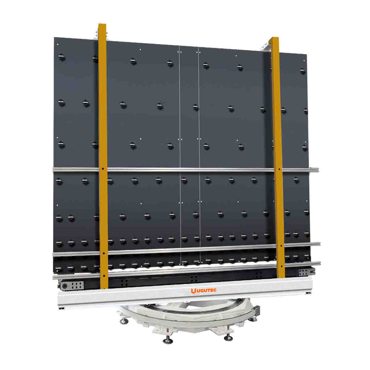 Mesa para el cambio de sentido del vidrio de 0-90° en una línea de proceso automática donde es necesaria la rotación de la orientación del trabajo. De esta forma se puede personalizar el diseño de la línea DVH en forma de L o U.